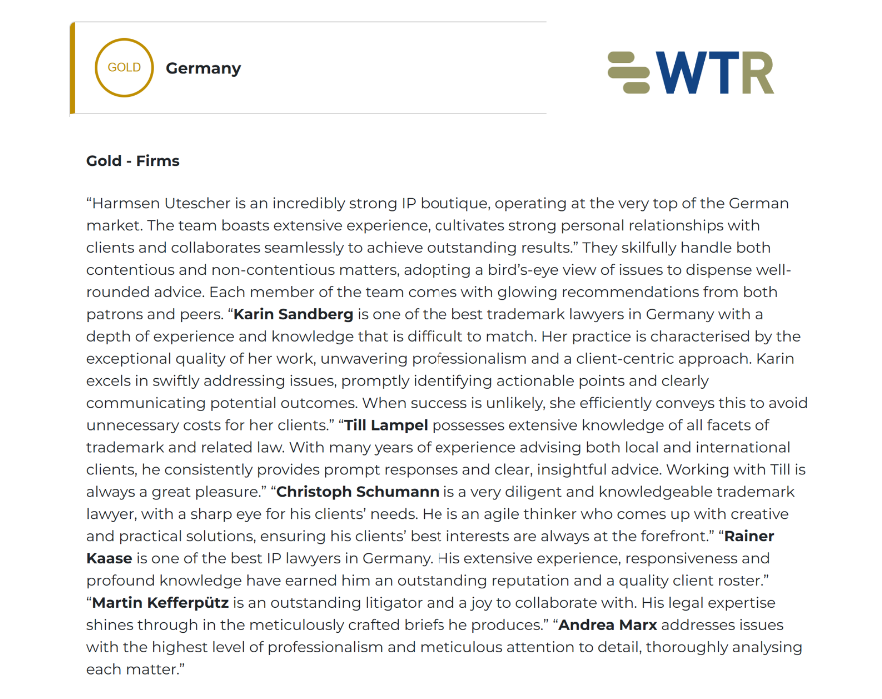 „Harmsen Utescher is an incredibly strong IP boutique, operating at the very top of the German market."WTR 1000 - The World's Leading Trademark Professionals 2026